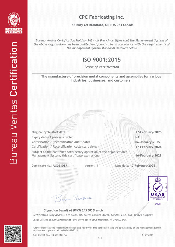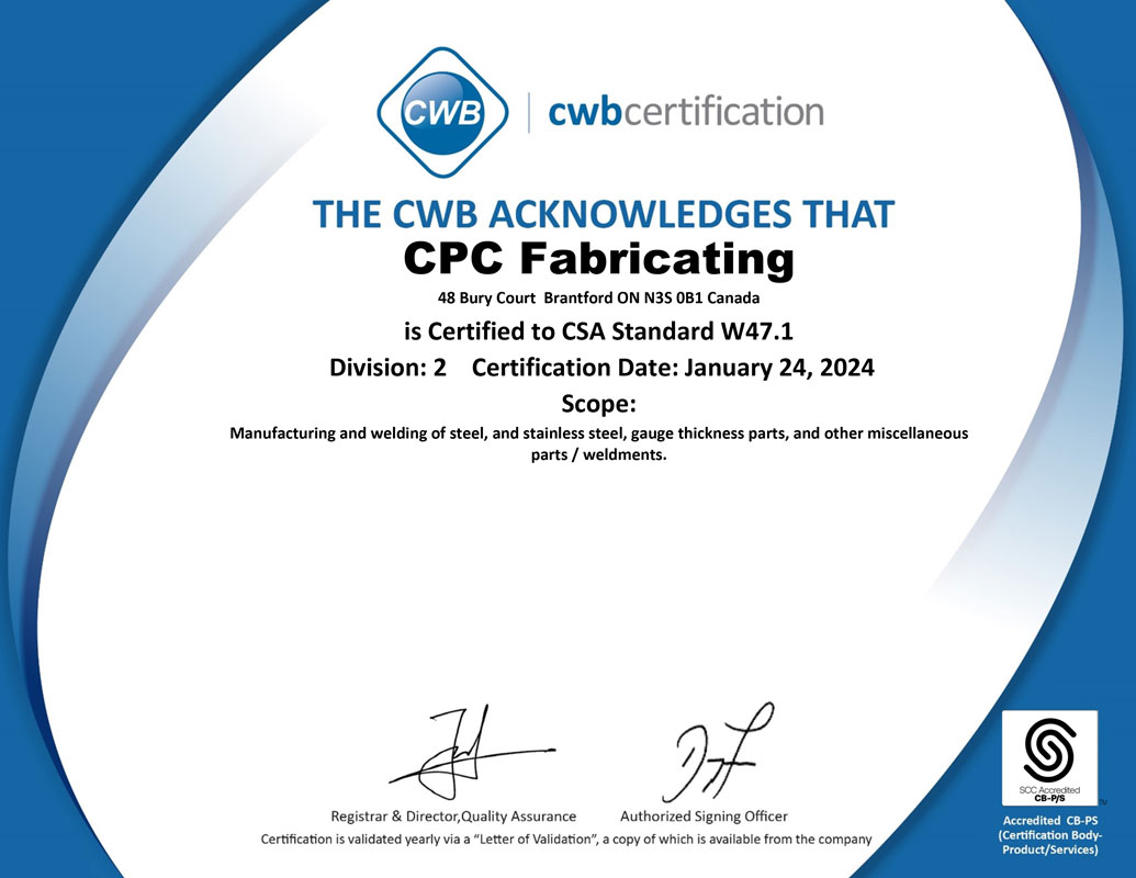 CPC Fabricating has fully embraced the rigorous standards of ISO 9001:2015, demonstrating an unwavering dedication to quality management across all facets of its operations. By aligning its processes with ISO 9001:2015 principles, CPC Fabricating ensures efficiency, consistency, and continual improvement to meet and exceed customer expectations.
